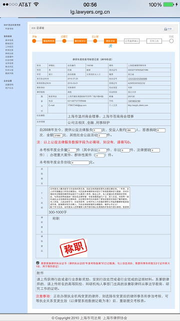 钟锦化律师一直依法依规执业,经常关注抨击中国社会不公不义丑恶现象,呼吁中国当局践行民主法治、保障人权自由。今年依照有关规定,在上海市律师协会网站“东方律师网”上填报表格参与一年一度律师执业证“年检”。根据网站“年检”表格清楚显示,钟锦化律师所在的上海君澜律师事务所以及上海市律师协会均已经在相应意见栏评定钟锦化律师2015年度“称职”(如图1所示)!按照惯例,上海市浦东新区司法局有义务在钟锦化律师执业证上加盖“2015年度”以及“律师年度考核备案专用章”(如图2所示)!上海市浦东新区司法局却知法犯法,无理粗暴对待依法依规执业的“称职”律师,非法干涉律所正常经营管理,不履行法定义务,他们究竟意欲何为??钟锦化律师希望上海市浦东新区司法局尽快改正粗暴违法行为,并呼吁国内外媒体和社会各界正义人士严重关注事态进展!!