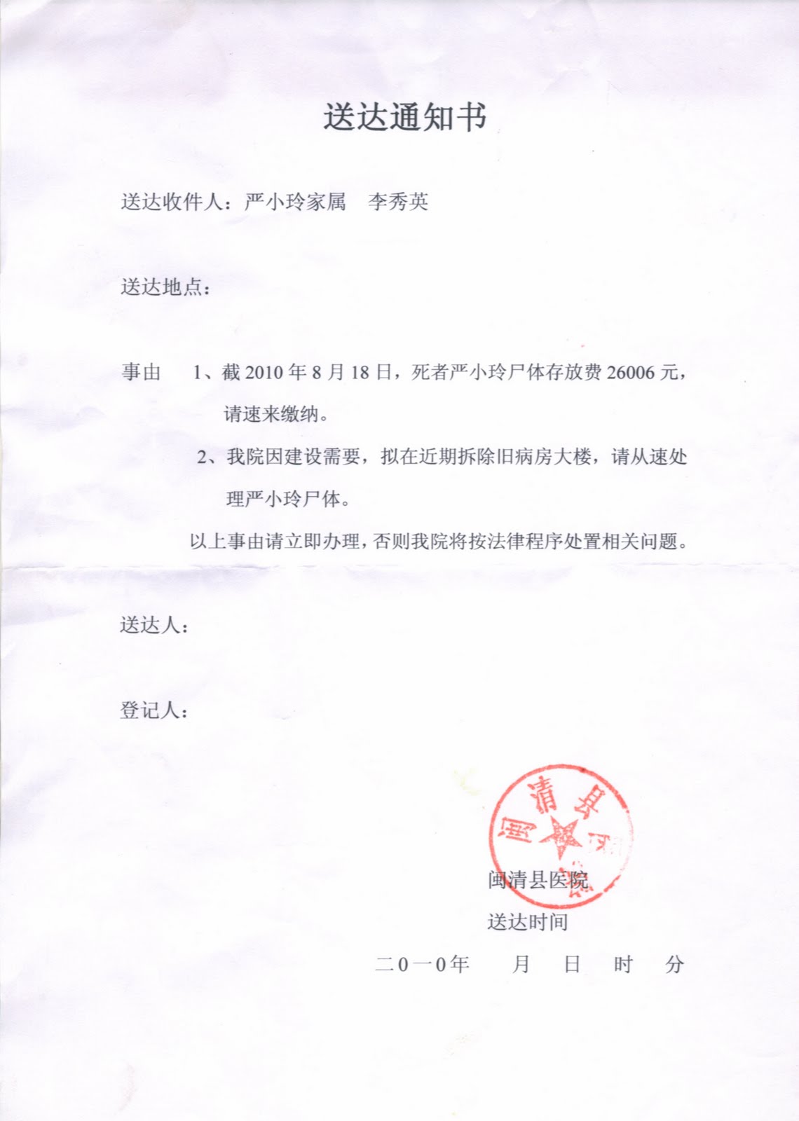 昨天下午4点左右,闽清县医院的一车辆停在马路上,保安拿出一份通知,称要林秀英尽快处理女儿严晓玲的尸体。林秀英感到莫名,就质问这个保安:这是刑事案件,处理尸体你们应该通知公安局,或者公安局通知我啊。这名保安无言以对,就留下通知后上车走了。