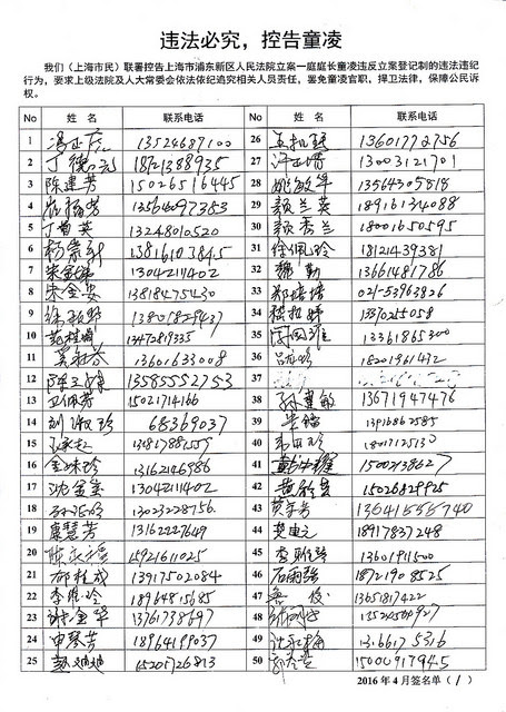 (2016年05月01日权利运动来稿刊登) 【编者按】冯正虎等1016位上海市民于2016年2月19日联署致函国家主席习近平、全国人大常委会,提出三项请求的首项就是:彻底清除“不接收诉状、既不立案又不作出裁定或者决定“等违法违纪情形,依法依纪追究相关人员责任,保障冯正虎等所有中华人民共和国公民的诉权。上千名联署人不仅仅是呼吁者,而是全面监督司法官员、保卫立案登记制的的践行者。