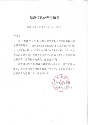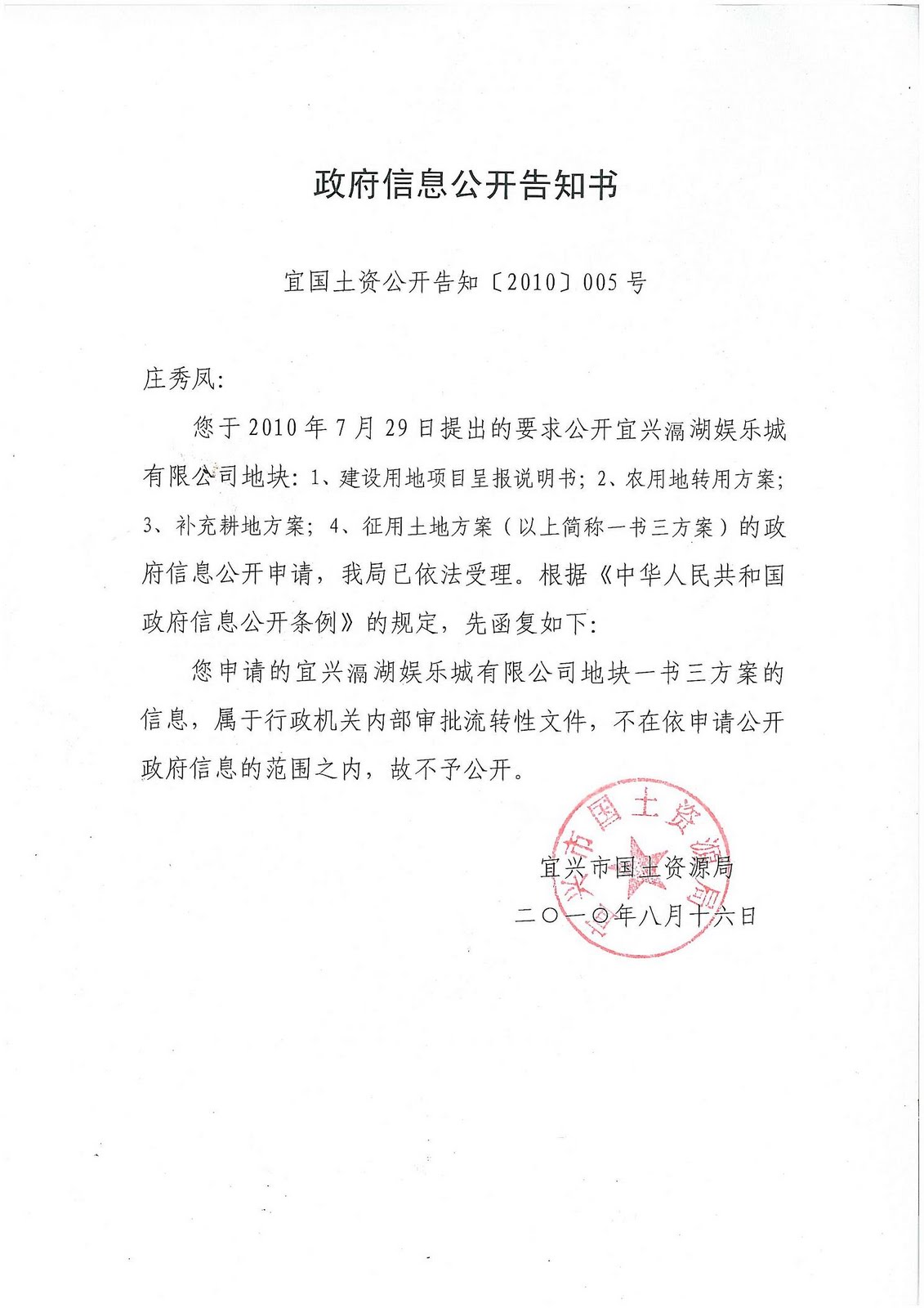 近日,江苏省宜兴市官林镇失地农民维权代表庄秀凤,收到宜兴市国土资源局一封信息公开答复告知书,在该告知书中称,宜兴市隔湖娱乐城地块的一书三方案的信息,属于行政机关内部审批流转性文件,不在依申请公开政府信息范围之内,不予公开。