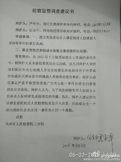 下附任全牛律师微博公开文章《六月三日要求天津方面调查赵威是否受辱之行简报》