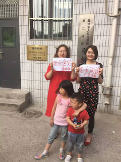 6月1日,李文足与被捕律师李和平的妻子王峭岭一同,来到二分检要求当面查询,却再被拒之门外,案管科要将她们转介到举报中心,传达室也拒绝为她们接通侦查监督科的电话。王峭岭当场向市长热线12345投诉,却被三次挂断电话。守门的穿制服人员见家属走近就立刻撕下了自己胸前的编号。 在传达室交涉近一小时后,案管科工作人员终于在电话中答复称案件仍未送检,但拒不透露自己的姓氏,在王峭岭追问下挂断电话。 王峭岭和李文足随后来到二分院的举报中心,实名举报天津市公安局预审总队的接待警察李斌(警号281196)滥用职权,阻止家属聘请的律师会见、解聘律师、拒绝家属存钱存物等等。期间,高姓的举报中心工作人员强调,此案有专人负责,之后会联系家属,连收下材料是否有收据的问题都拒绝回答。 王峭岭和李文足在举报中心提交表格后,用口红在纸上写“要求会见 李和平”、“要求通信 王全璋”,与六岁的李和平孩子李佳美和三岁王全璋孩子王广微一同,在二分检门前留影并接受采访。李佳美对着镜头喊:“爸爸,快回家!”妈妈们在接受采访时,两个孩子就在举报中心的台阶上开心地玩起了玩具,这天刚好是儿童节。 李文足和王峭岭上午和下午在二分检交涉的全程中,一名便装男子一直在一辆车牌为津D VA958的凯迪拉克中盯着她们。