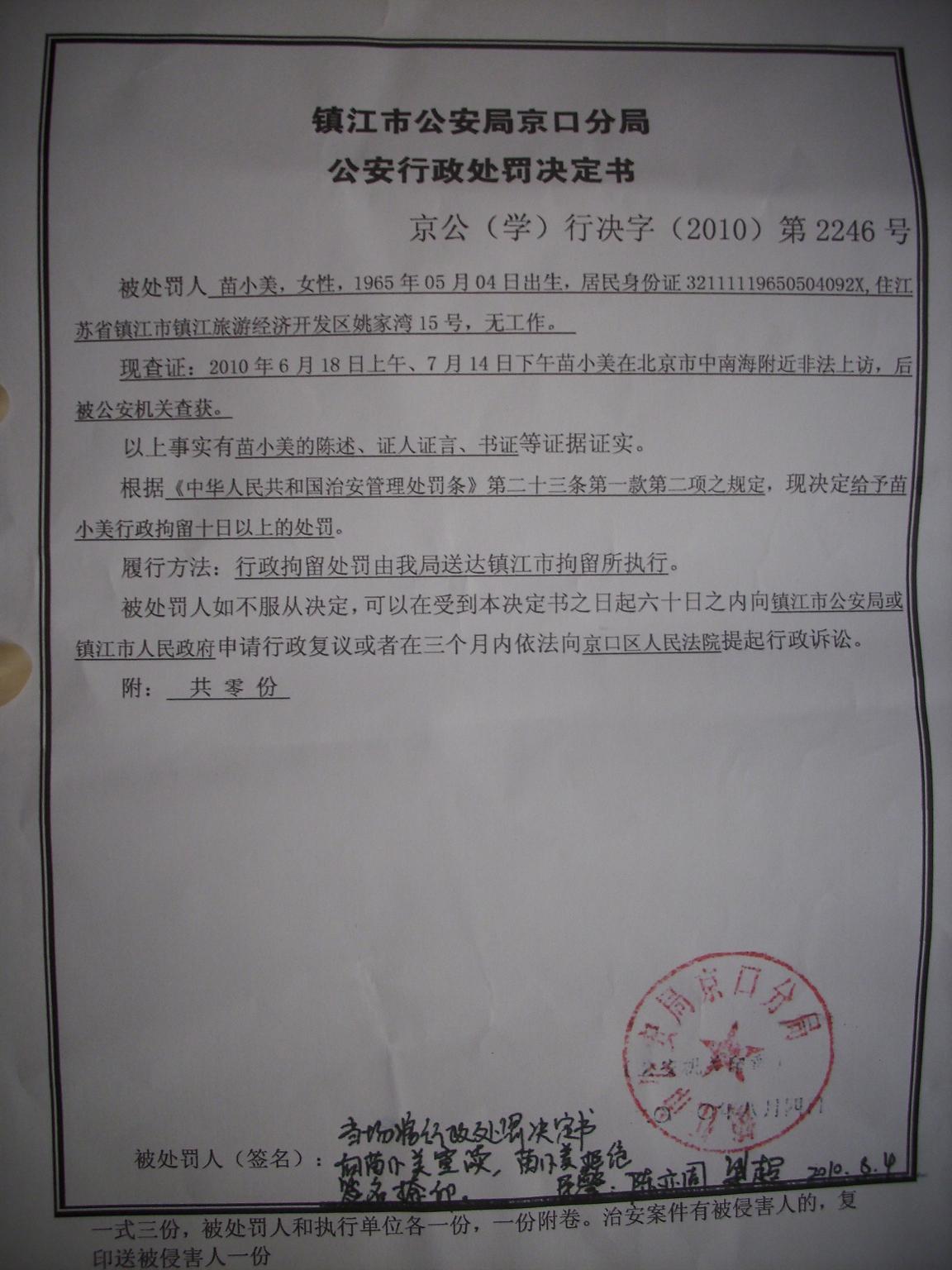 镇江市被拆迁居民苗小美出拘留所受劳教警告