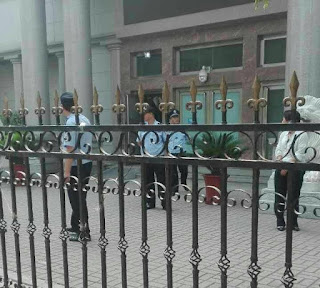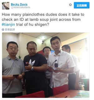 据现场媒体报道法院外面和四周路口均有警察和便衣人员严密封锁。记者在法院周围没有看到被捕律师的亲属或围观人群。附近小区居民说,这两天法院有大案子在审理,警察不准无关车辆和行人进入。美国之音记者向执勤警员表明身份后被告知媒体人员不得入内。立即有男女多名便衣人员围上前来,查验证件后,将记者用为外媒准备的中巴送到几公里外的新桃园酒店。当局在该酒店设立了媒体中心,专供采访709律师颠覆案庭审的外媒使用。
