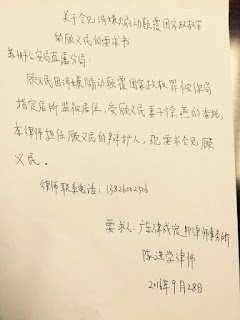权利运动编辑员获悉,2016年9月28日,陈进学律师与顾义民妻子徐燕前往苏州市公安局申请会见被以“涉嫌煽动颠覆国家政权罪”监视居住的顾义民,及要求和办案警察见面了解案情。但遭苏州市公安局直属分局警察以办案警察不在拒绝会见。