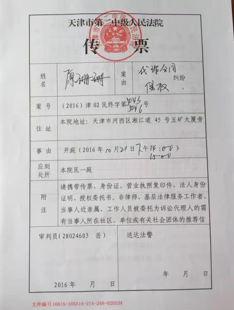 嗣后,我本人並代表谢燕益的其他家属起诉这不知从哪冒出來的律师称「官派律师陈文海」,一审法院不予受理,上诉天津市第二中级人民法院,天津二中院于10月21日下午3:00开庭审理。