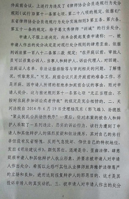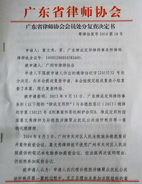 权利运动编辑员获悉,因代理孙德胜案,广东省律师协会发出对葛文秀律师的《广东省律师协会会员处分复查决定书》,维持广州市律师协会对葛文秀律师“训诫”处分决定。