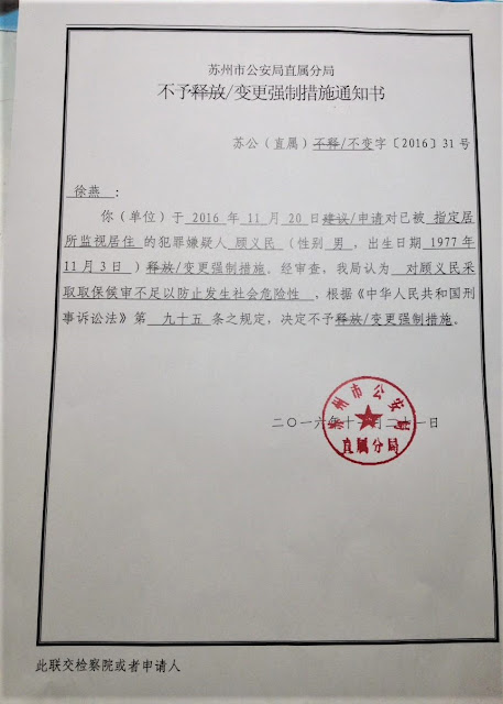 2016年9月13日早上,苏州大抓捕之一顾义民的妻子徐燕收到通知书,称顾义民于9月9日被苏州市公安局直属分局以“涉嫌煽动颠覆国家政权罪”监视居住。