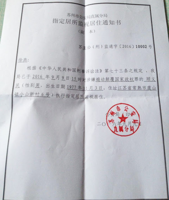9月13日早上,苏州大抓捕之一顾义民的妻子徐燕收到通知书,称顾义民于9月9日被苏州市公安局直属分局以“涉嫌煽动颠覆国家政权罪”监视居住。