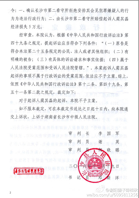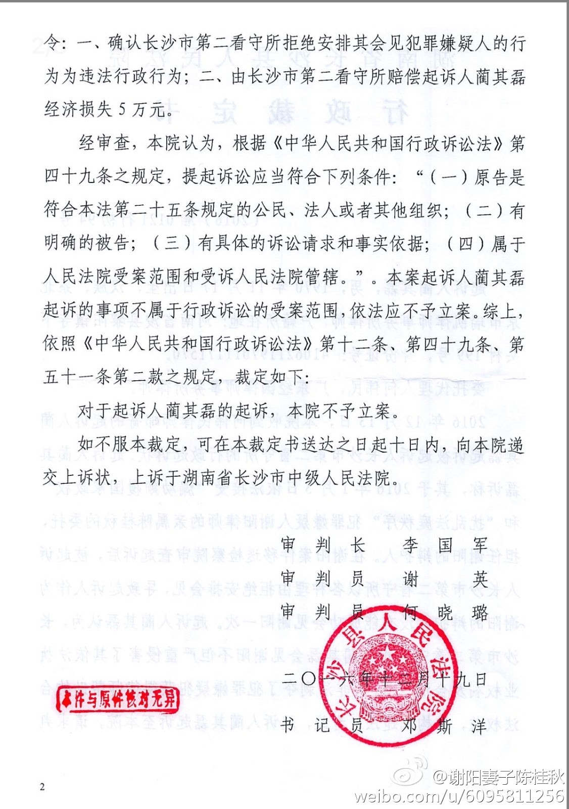 权利运动编辑员获悉,日前709大抓捕事件中被捕律师谢阳其辩护律师就遭长沙市第二看守所搪塞拒绝律师会见当事人等情况,向长沙市长沙县人民法院提起行政诉讼。2016年12月19日被长沙县人民法院以“不属于行政诉讼受案范围,不予立案”为由驳回诉讼。