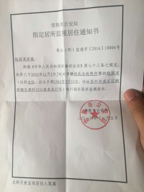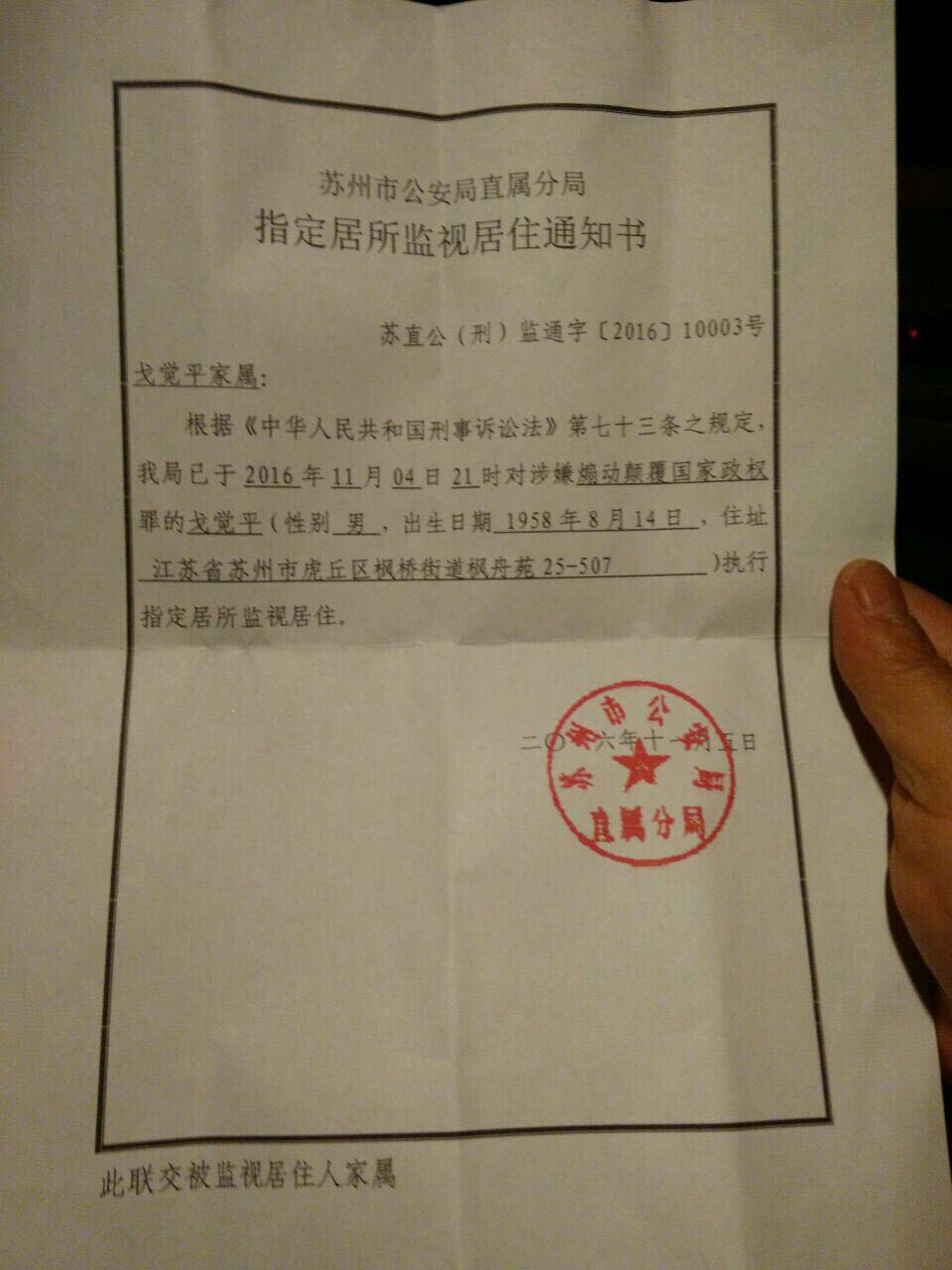 权利运动编辑员获悉,苏州908大抓捕事件持续升级,2016年11月5日,江苏苏州维权人士戈觉平(网络名称:奔博)被苏州市公安局直属分局以涉嫌“煽动颠覆国家政权罪”指定居所监视居住,其妻陆国英,于2016年11月5日早上7点,被以涉嫌“扰乱法庭秩序”,指定监视居住。但通知书上未显示指定居所监视居住的地方及结束时间。