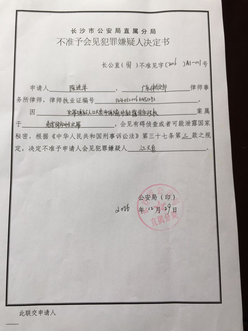 2016年12月29日辩护律师陈进学收到长沙市公安局直属分局不准予会见犯罪嫌疑人决定书,长沙市公安局直属分局以江天勇涉嫌煽动颠覆国家政权罪案属于危害国家安全犯罪为由,会见有碍侦查或者可能泄露国家秘密,拒绝律师会见。长公直(国)不准见字[2016]A1-001号