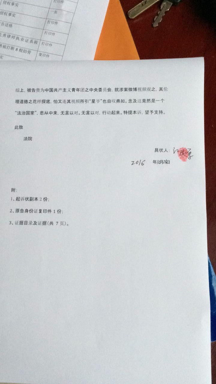 2016年12月26日江天勇父亲向北京共青团中央邮寄了侵犯江天勇名誉权起诉书;