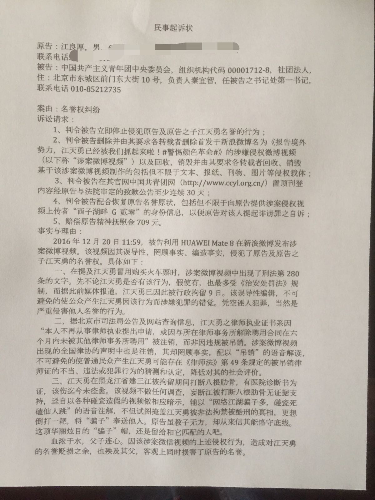 江天勇家属就视频歪曲事实抹黑当事人一事 向北京共青团中央提起民事起诉其侵犯当事人名誉权