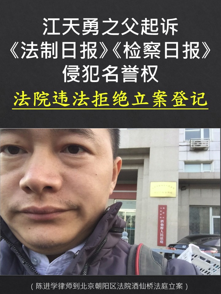 2016年12月22日下午,受江天勇父亲委托,陈进学律师就法制日报社和检察日报社关于江天勇案的报道侵犯了名誉权为由,向北京朝阳区法院酒仙桥法庭提起诉讼。某高姓法官看了材料后,称该案尚处于公安刑事侦查阶段,法院不能受理该案,否则是干涉法律,坚决不收案件材料。同日,江天勇父亲亦通过邮寄方式向上海市闸北区人民法院起诉上海东方报业有限公司(此为澎湃新闻所属公司)侵犯名誉权。