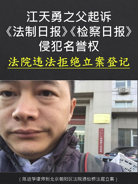 权利运动编辑员获悉,2016年12月22日下午,受江天勇父亲委托,陈进学律师就法制日报社和检察日报社关于江天勇案的报道侵犯了名誉权为由,向北京朝阳区法院酒仙桥法庭提起诉讼。某高姓法官看了材料后,称该案尚处于公安刑事侦查阶段,法院不能受理该案,否则是干涉法律,坚决不收案件材料。同日,江天勇父亲亦通过邮寄方式向上海市闸北区人民法院起诉上海东方报业有限公司(此为澎湃新闻所属公司)侵犯名誉权。