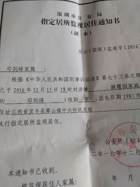 2016年12月20日,邓剑锋、邓洪成家属收到深圳市公安局的指定居所监视居住通知书。深圳市公安局以邓剑锋、邓洪成涉嫌颠覆国家政权罪执行指定居所监视居住。