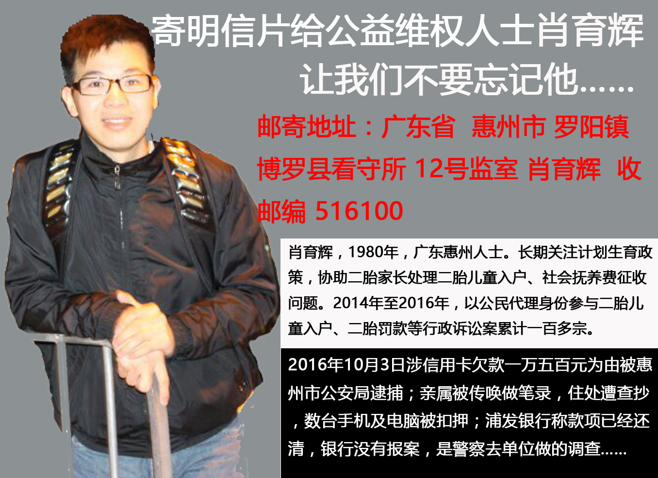 权利运动编辑员获悉,近日中国多地网友邮寄明信片给涉信用卡欠款一万五百元为由被惠州市公安局逮捕的计生公益维权人士肖育辉。