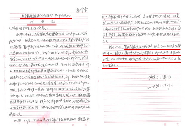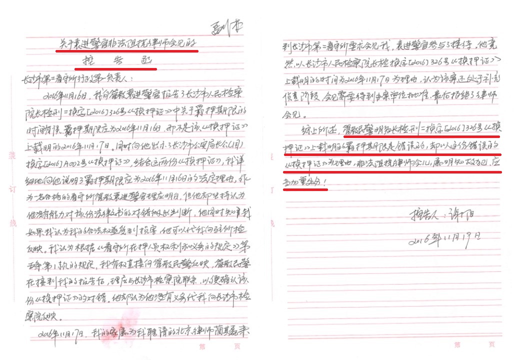 权利运动编辑员获悉,709大抓捕事件中被捕律师谢阳委托其辩护律师传出亲笔信,对长沙市第二看守所管袁进警官非法阻挠律师会见提起控告。