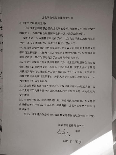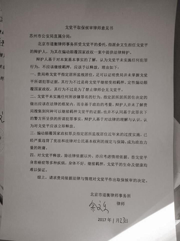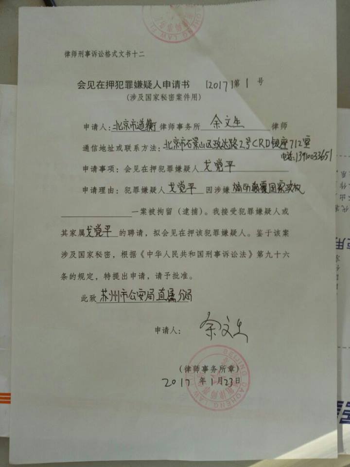 2017年1月23日,苏州大抓捕事件中被以嫌“煽动颠覆国家政权”罪监视居住的戈觉平其代理律师余文生律师再向苏州市公安局直属分局递交要求会见戈觉平的书面申请,同时向直属分局递交了对戈觉平取保候审的书面申请。苏州市公安局接待人员表示会书面回复余文生律师的申请。