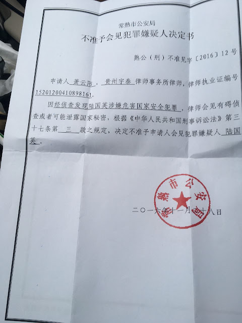 2016年12月3日,陆国英其律师萧云阳收到常熟市公安局针对之前申请会见及取保的答复,常熟市公安局以陆国英涉嫌危害国家安全犯罪,律师会见有碍侦查或者可能泄露国家机密而拒绝律师会见及不予变更强制措施。