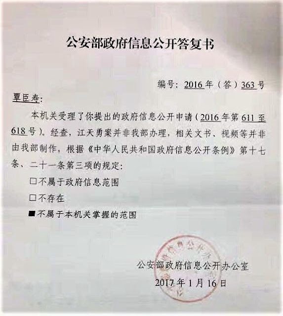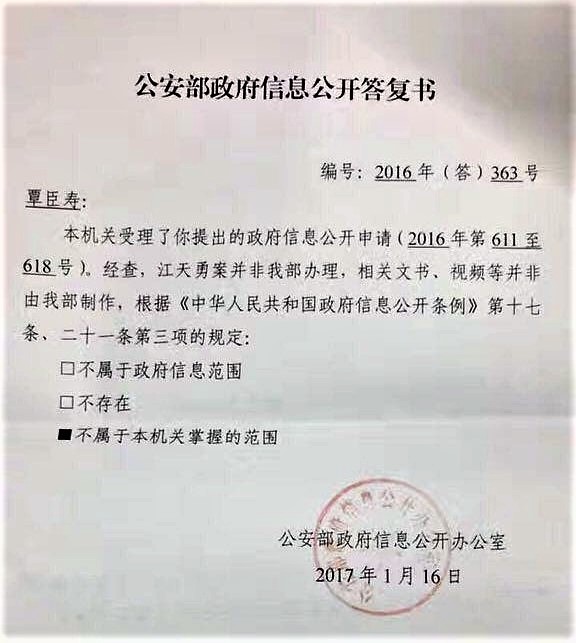 2017年1月20日,中国公安部以江天勇案件并非该部办理为由不接纳此前律师关于江天勇被捕情况的政府信息公开申请。公安部政府信息公开办公室 2016年(答)263号。