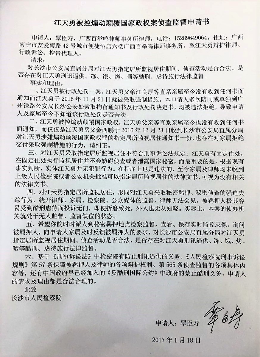 2017年1月18日,被以涉嫌煽动颠覆国家政权罪刑拘的江天勇其辩护律师覃臣寿以邮寄的方式向长沙市检察院提交《江天勇被控煽动颠覆国家政权案侦查监督申请书》,请求对长沙市公安局直属分局对江天勇指定居所监视居住期间,侦查活动是否合法,是否存在对江天勇刑讯逼供、冻、饿、烤、晒等酷刑、虐待施行法律监督。