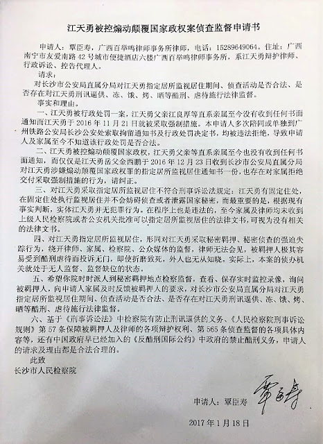 权利运动编辑员获悉,2017年1月18日,被以涉嫌煽动颠覆国家政权罪刑拘的江天勇其辩护律师覃臣寿以邮寄的方式向长沙市检察院提交《江天勇被控煽动颠覆国家政权案侦查监督申请书》,请求对长沙市公安局直属分局对江天勇指定居所监视居住期间,侦查活动是否合法,是否存在对江天勇刑讯逼供、冻、饿、烤、晒等酷刑、虐待施行法律监督。