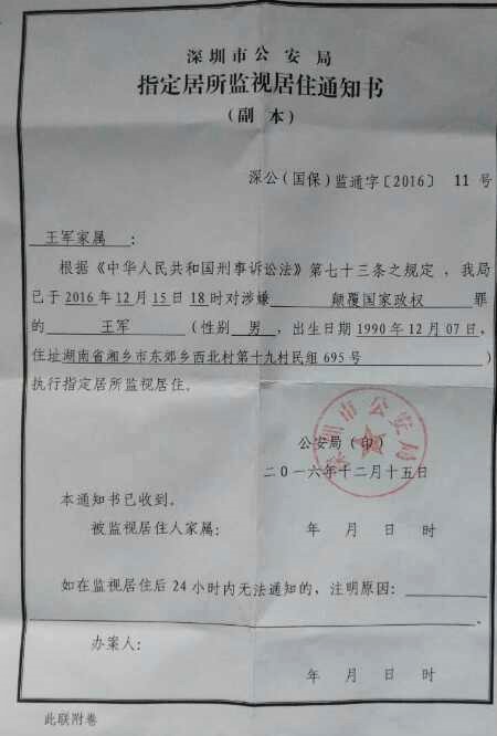 权利运动编辑员获悉2017年1月7日,深圳大抓捕事件中王军家属收到深圳市公安局的指定居所监视居住通知书。深圳市公安局以王军涉嫌颠覆国家政权罪执行指定居所监视居住。深公(国保)监通字[2016]11号.