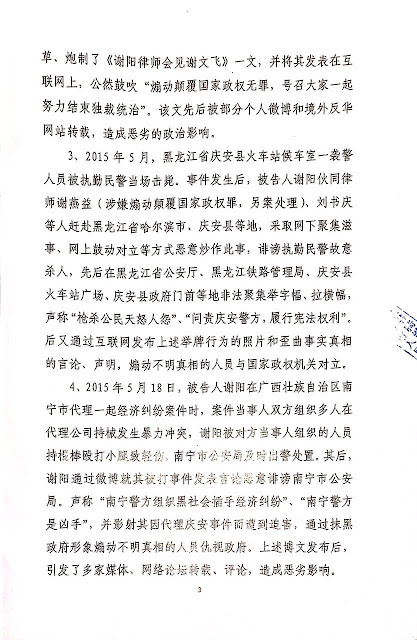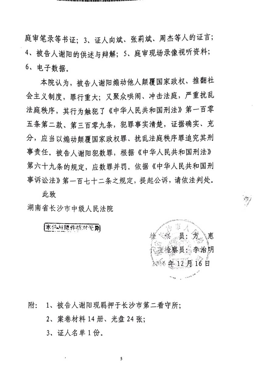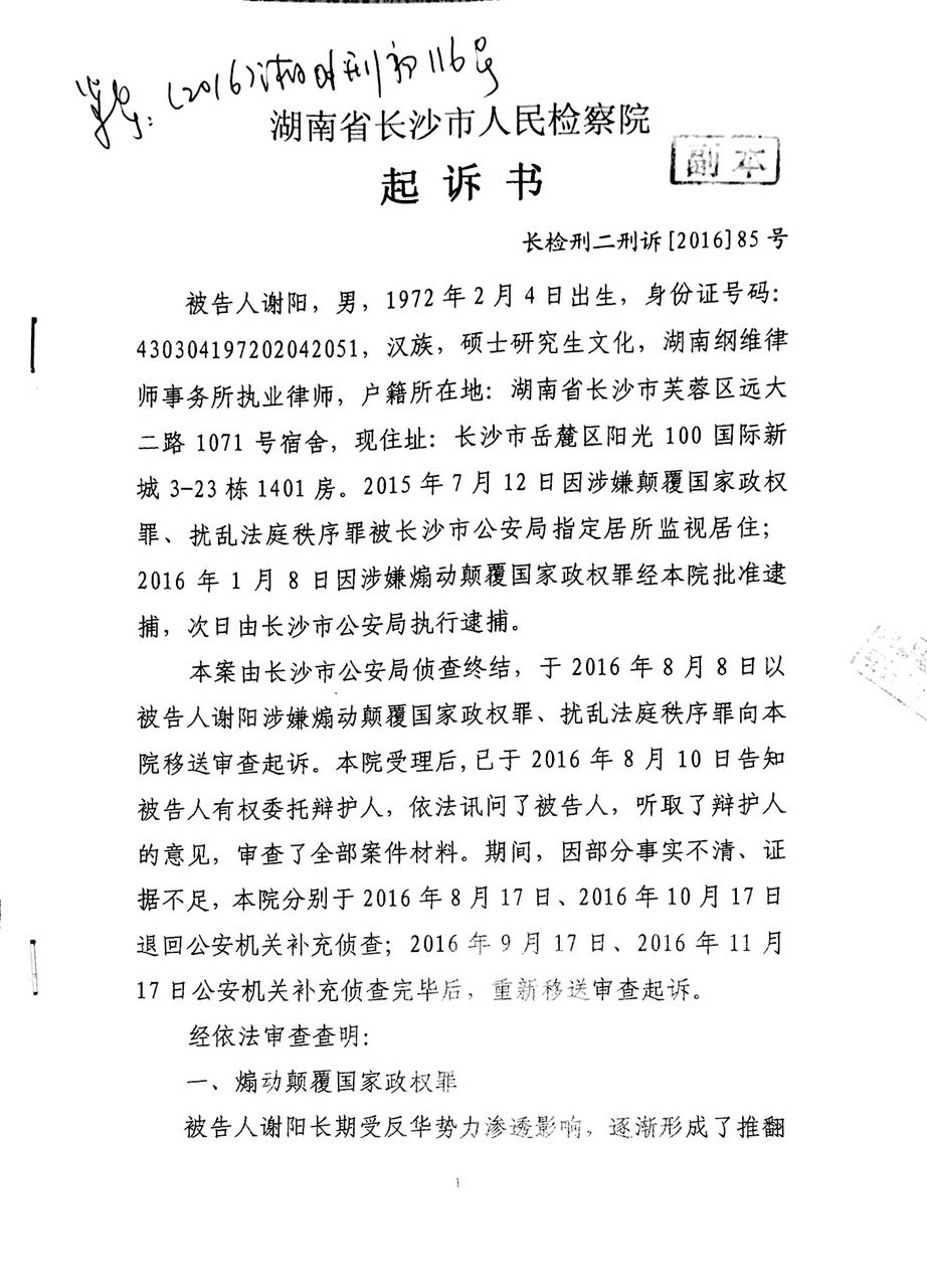 权利运动编辑员获悉,2017年1月4日下午,刘正清律师与谢阳妻陈桂秋来到长沙市中级人民法院刑二庭办理相关法律手续,核对案卷材料,长沙市检察院起诉书显示,长沙市检察院以谢阳微博言论及会见纪要等内容起诉其煽动颠覆国家政权罪。长检刑二刑诉[2016]85号。