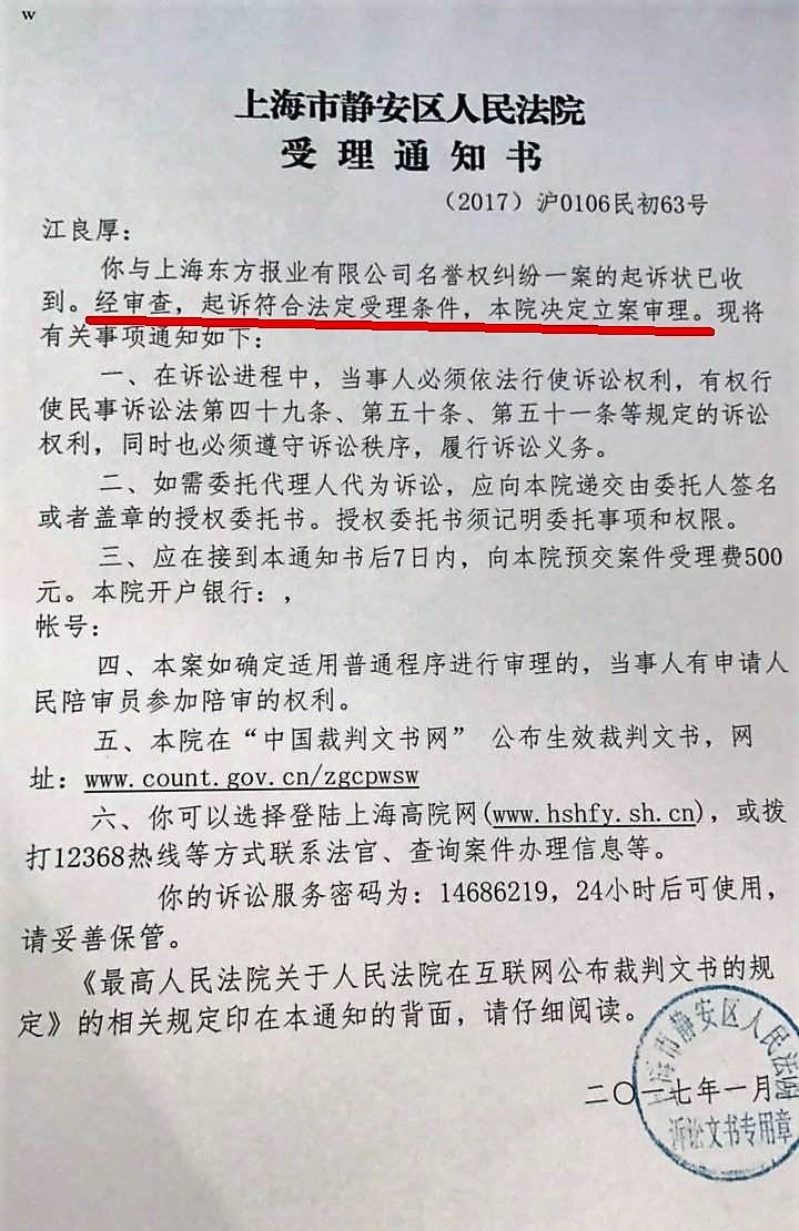 权利运动编辑员获悉,2017年1月4日被以涉嫌煽动颠覆国家政权罪刑拘的江天勇律师其辩护律师陈进学收到上海市静安区法院对江天勇之父江良厚诉上海东方报业有限公司(澎湃新闻所属公司)名誉权纠纷案受理通知书,但相同的案件在北京朝阳区法院和广州越秀区法院却不立案、不收材料、不出书面裁定。