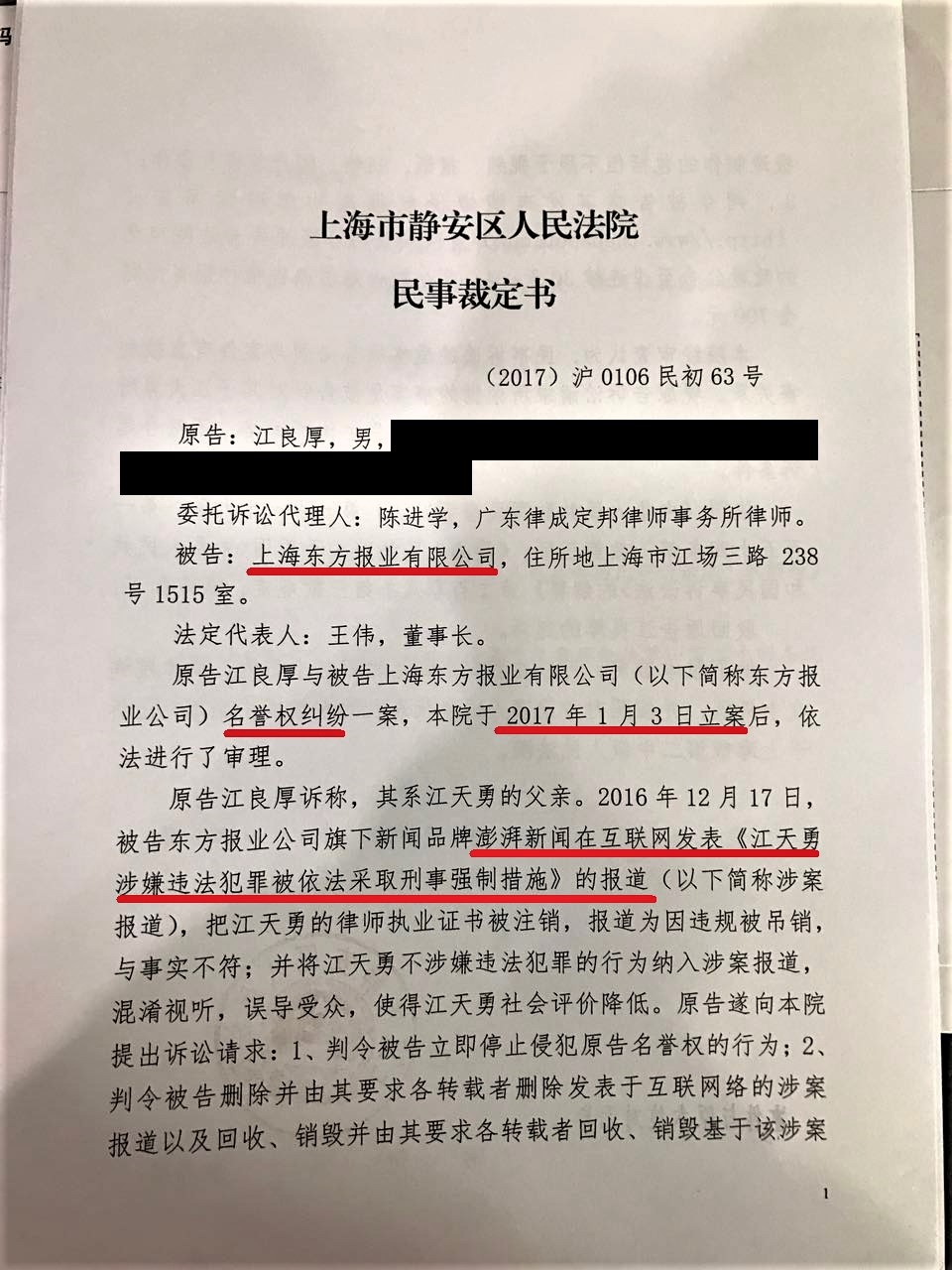 2017年1月4日其辩护律师陈进学收到上海市静安区法院对江天勇之父江良厚诉上海东方报业有限公司(澎湃新闻所属公司)名誉权纠纷案受理通知书,但相同的案件在北京朝阳区法院和广州越秀区法院却不立案、不收材料、不出书面裁定。