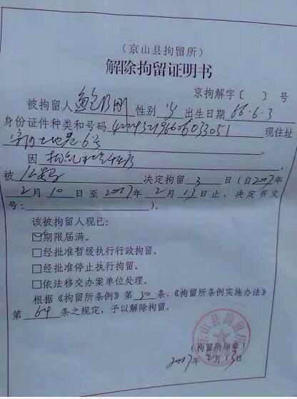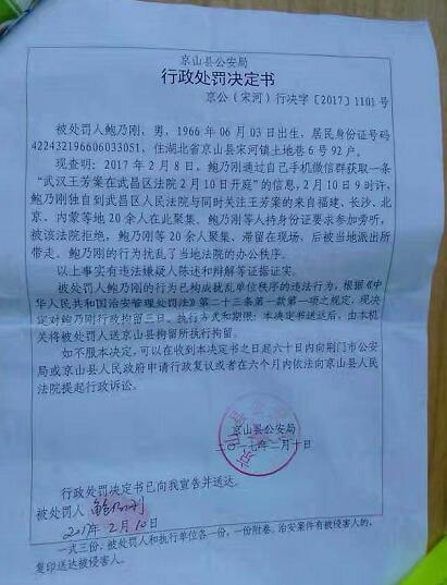据了解,鲍乃刚行政拘留时当局没有出示没有任何手续,办案人员告诉鲍乃刚与家人是要被拘留7天,鲍乃刚进拘留所后一再问办案人员索要拘留手续,拘留所后补办相关手续。行政处罚决定书上显示,京山县公安局以鲍乃刚扰乱当地法院的办公秩序为由,行政拘留3天。