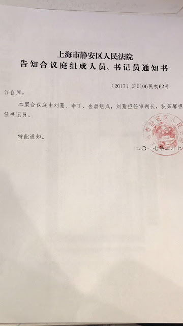 709大抓捕 江天勇父亲江良厚诉澎湃新闻抹黑案 收到上海市静安区人民法院告知合议庭组成人员通知书