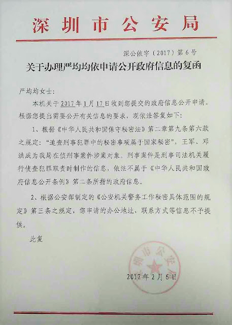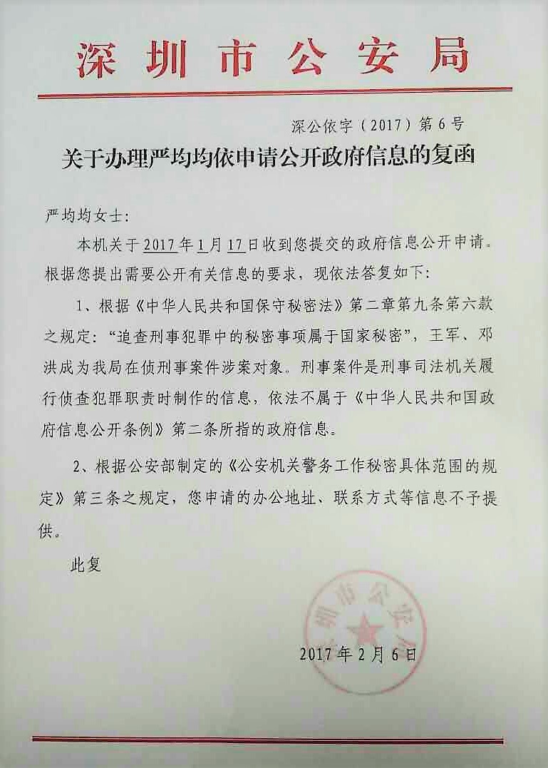 权利运动编辑员获悉,2017年2月8日,深圳大抓捕事件当事人王军妻子严均均收到此前申请的政府信息公开答复。深圳市公安局以申请内容“王军被监视居住的具体地址”以“追查刑事犯罪中的秘密事项属于国家秘密”为由不予提供。对申请“深圳市公安局国保支队的办公室地址和联系方式、该案件办案警察联系方式”以《公安机关警务工作秘密具体范围的规定》为由不予提供。深公依字(2017)第6号