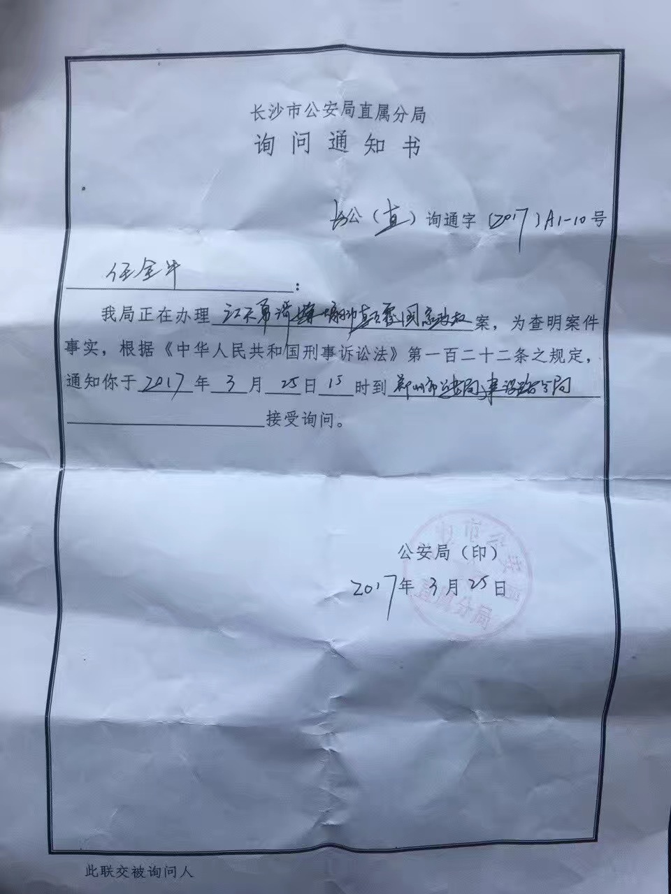 2017年3月25日,郑州维权律师任全牛因江天勇案,遭长沙市公安局直属分局询问专案组的侦察员屈可、胡定康于郑州询问并做笔录。