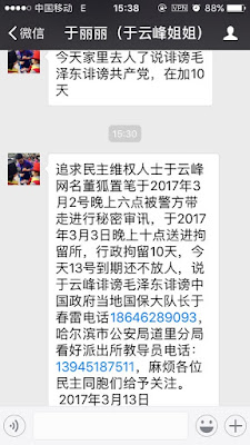 因转发谢阳律师被酷刑消息 哈尔滨维权人士于云峰遭哈尔滨公安局行政拘留十天后 又被以诽谤毛泽东和中国政府罪再拘十天 其家人被警告不许将其再被拘消息发上网以及接受外媒采访