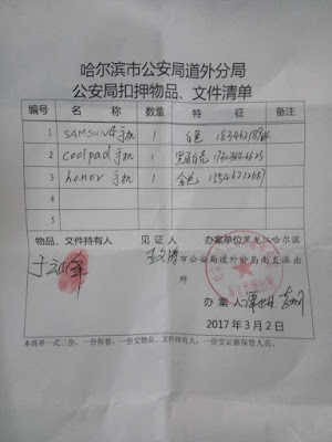 权利运动编辑员获释,2017年3月13日,哈尔滨民主维权人士于云峰(网名董狐直笔)因为在微信群转发谢阳律师受酷刑的消息,于2017年3月2号晚上六点被哈尔滨市公安局道理分局康安路派出所以散布谢阳律师在看守所遭受酷刑,受到非法羁押,扰乱公共秩序罪遭行政拘留10天,13日公安局又以他诽谤毛泽东,诽谤中国政府罪再行政拘留十天,公安局警察并警告其家人不许将其再被拘留消息发上网以及接受外媒采访。