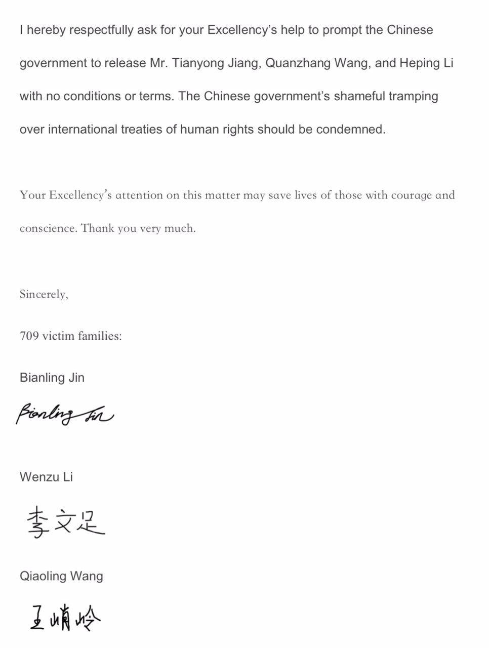 中国709案的事态紧急,促使我们给您写这第二封信。