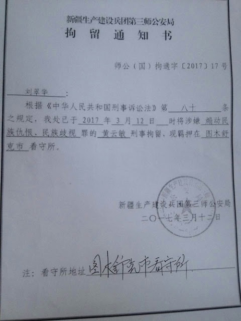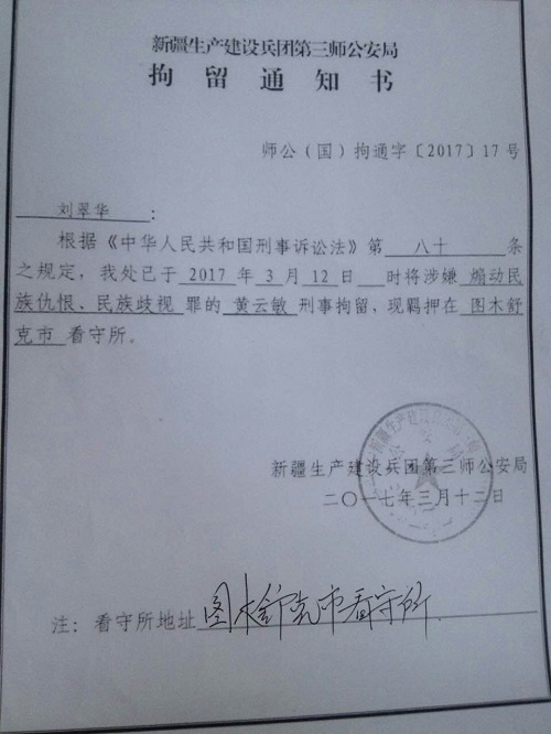 2017年3月7日因帮助农三师农场职工维权,被当地公安局以其“手机内存有色情图片”处以行政治安拘留5日,原本于12日届满。但随后再被公安以涉嫌“煽动民族仇恨、民族歧视罪”刑事拘留。2017年3月13日黄云敏家属收到扣查物品清单指其家中电脑、手机、储存卡、笔记本以及若干封书信遭扣押。