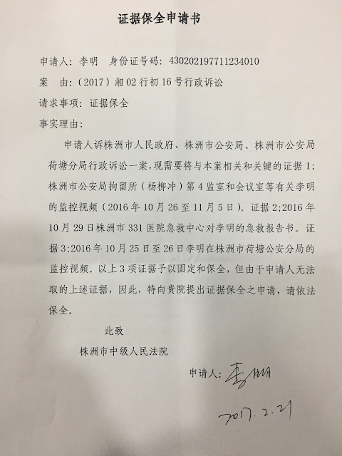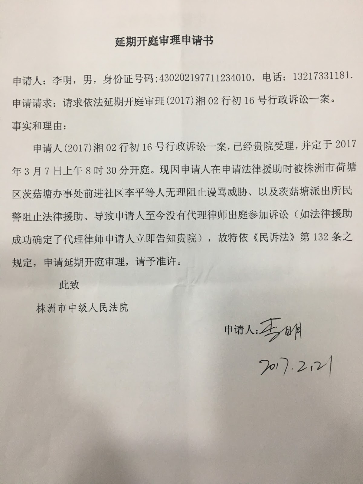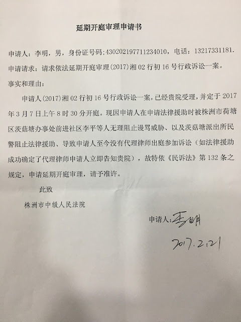 权利运动编辑员获悉,李明诉讼株洲市人民政府、株洲市公安局、株洲市公安局荷塘分局治安行政处罚一案,因李明向株洲市中级人民法院申请涉案证据保全和延期开庭审理,开庭日期已更改到2017年3月16日上午8时30分,庭审地点不变,仍然在株洲市中级人民法院审判大楼五楼第十一审判庭,该案原定于2017年3月7日上午8时30分开庭审理。