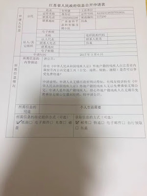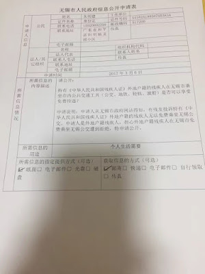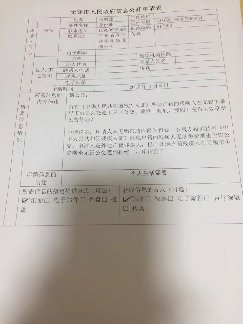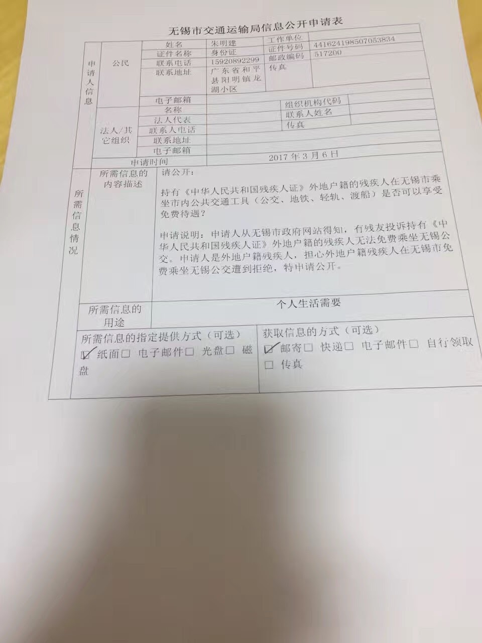 权利运动编辑员获悉,2017年3月6日上午10点,因一直在无锡生活的湖南户籍残疾人凌先生是外地户籍的残疾证多次被无锡公交拒绝免费乘坐,广东残疾维权人士朱明建通过广东省和平县邮政局将一份政府信息公开申请表分别邮寄给了江苏省人民政府、无锡市人民政府、无锡市交通运输局,申请公开无锡公交限制外地户籍残疾人免费的法律依据。