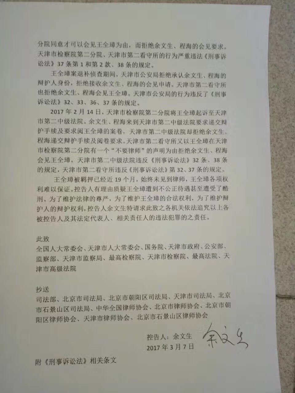 2016年8月7日王全璋案移送天津市人民检察院第二分院审查起诉,控告人余文生之后来到天津市检察院第二分院要求阅王全璋的案卷。被天津市检察院第二分院以王全璋声明“不要任何律师为他辩护”为由而拒绝控告人余文生及王全璋的另一辩护人程海律师阅卷,拒绝余文生、程海查看王全璋的声明,拒绝接收余文生、程海为王全璋辩护的辩护手续。天津市第二看守所则以必须经天津市检察院第二分院同意才可以会见王全璋为由,而拒绝余文生、程海的会见要求。天津市检察院第二分院、天津市第二看守所的行为严重违法《刑事诉讼法》37条第1和第2款、38条的规定。