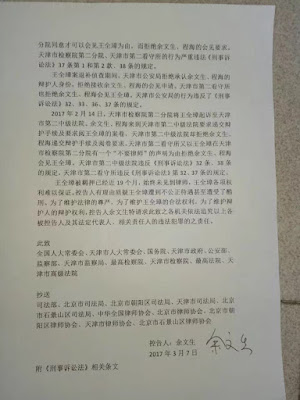 2017年2月24日,709大抓捕家属李文足与王峭岭再次前往天津二中院了解王全璋案情况,家属要求律师到来陪同才能会见法官,遭李书记员推诿。