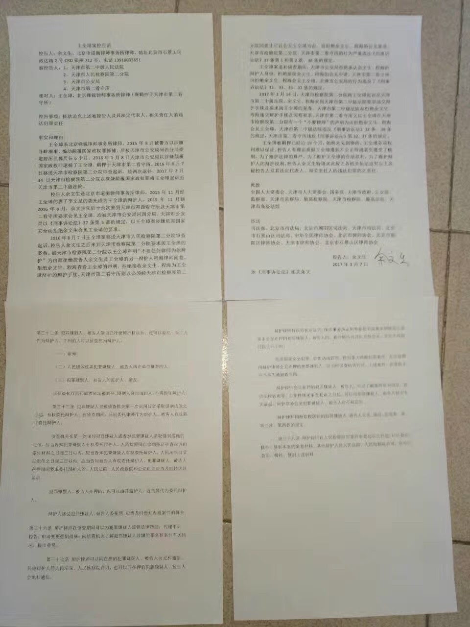 权利运动编辑员获悉,2017年3月7日,被天津市检察院第二分院以“涉嫌颠覆国家政权罪”起诉的王全璋律师其辩护律师余文生向全国人大常委会等21个单位邮寄《王全璋案控告函》控告天津市第二中级法院、天津市检察院第二分院、天津市公安局、天津市第二看守所。