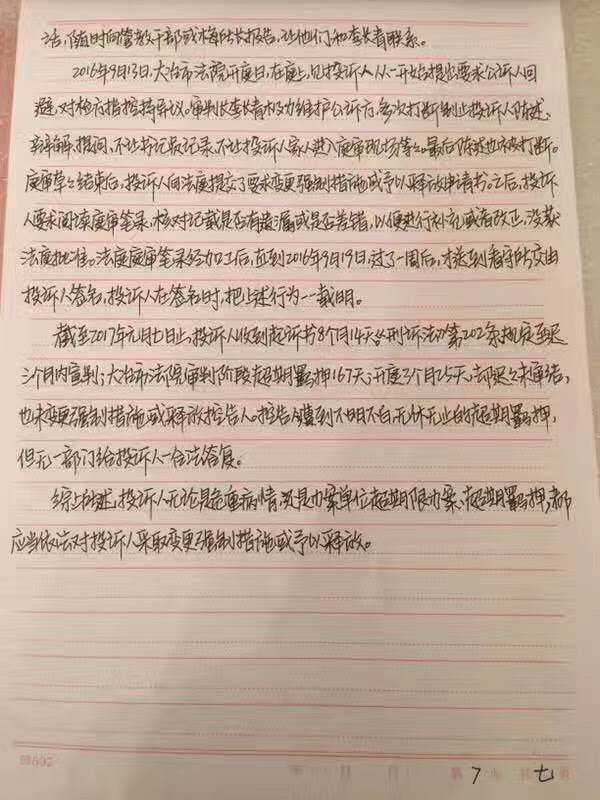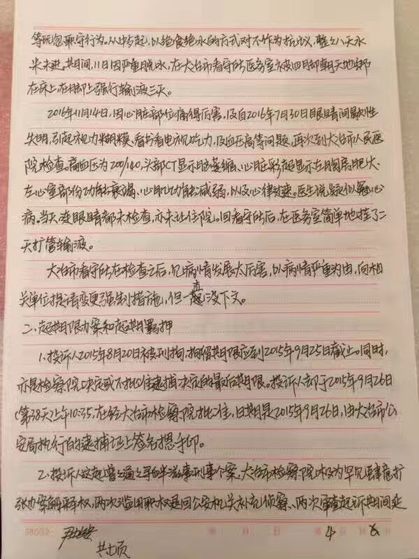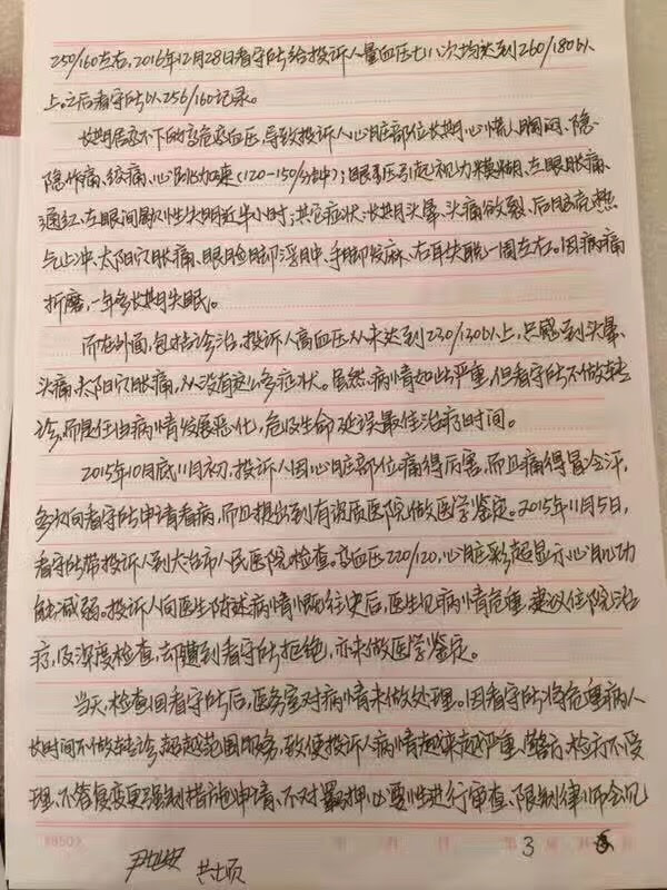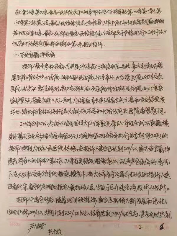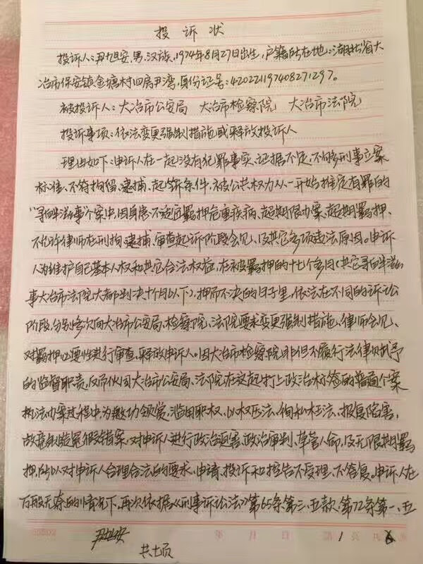 权利运动编辑员获悉,因穿文化衫声援屠夫被以涉嫌寻衅滋事罪拘押的尹旭安,就因其身患不适应羁押危重疾病,及被办案单位超期限办案,超期羁押,不允许律师在刑拘,逮捕,审查起诉阶段会见及其它多项违法原因等事项对大治市公安局,大治市检察院,大治市法院作出投诉,要求应当依法对其采取变更强制措施或予以释放。