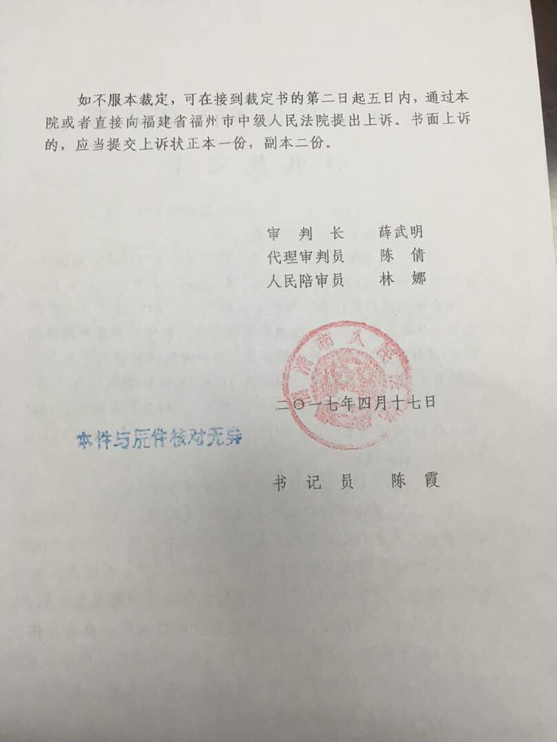 权利运动编辑员获悉,2017年4月21日,屠夫吴淦父亲徐孝顺职务侵占案的辩护人林洪楠律师收到福清市人民法院送达的刑事裁定书,得知徐孝顺职务侵占案应福清市人民检察院请求,福清市人民法院已经作出裁定,准许福清市人民检察院撤回起诉。