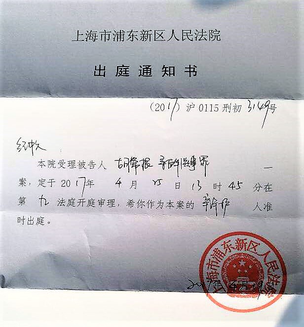 2017年4月20日,遭浦东新区检察院以“寻衅滋事罪”批捕羁押的上海维权人士胡常根案件将于4月25日在上海市浦东新区人民法院第九法庭开庭审理。