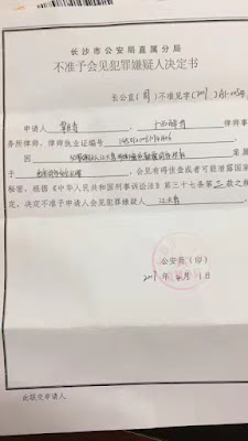 709大抓捕 江天勇其辩护律师收到长沙市公安局直属分局以会见有碍侦查或可能泄露国家秘密为由不准予会见的决定书