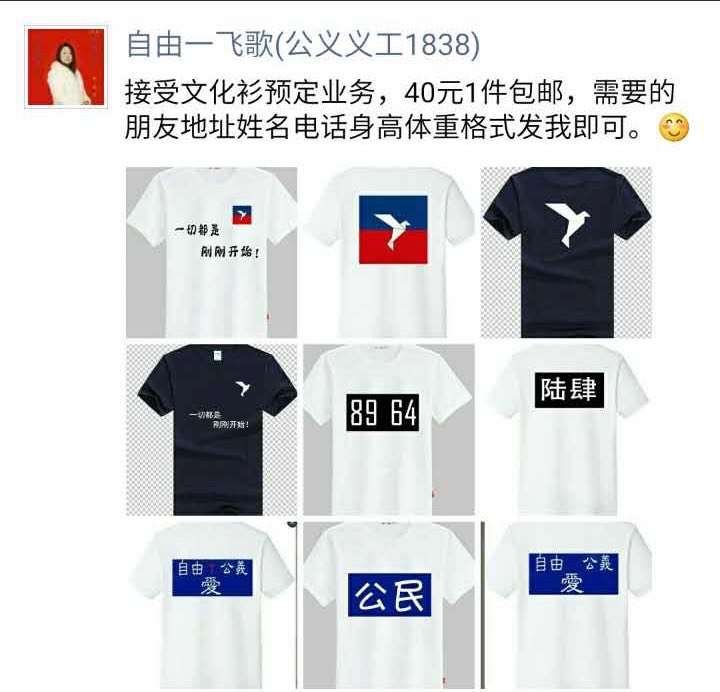 权利运动编辑员获悉,2017年5月27日,湖南公民邵凤平(网名:自由飞歌)因为在网络宣传并接受文化衫预定业务被居住地南岳区国保电话约谈,国保口气强硬的告诫其不要在网络卖含敏感图案的文化衫,并称其行为是反社会的。邵凤平感觉受到威胁,质问国保文化衫上的图案哪里有违法之处?哪一点反了社会?并提醒国保明明知道正义在哪方却还要是非黑白颠倒、为虎作伥,以后会遭到清算。邵凤平表示卖文化衫就是想挣点生活费而已,因为教育、医疗、养老、住房几座大山让她感到生活压力巨大。